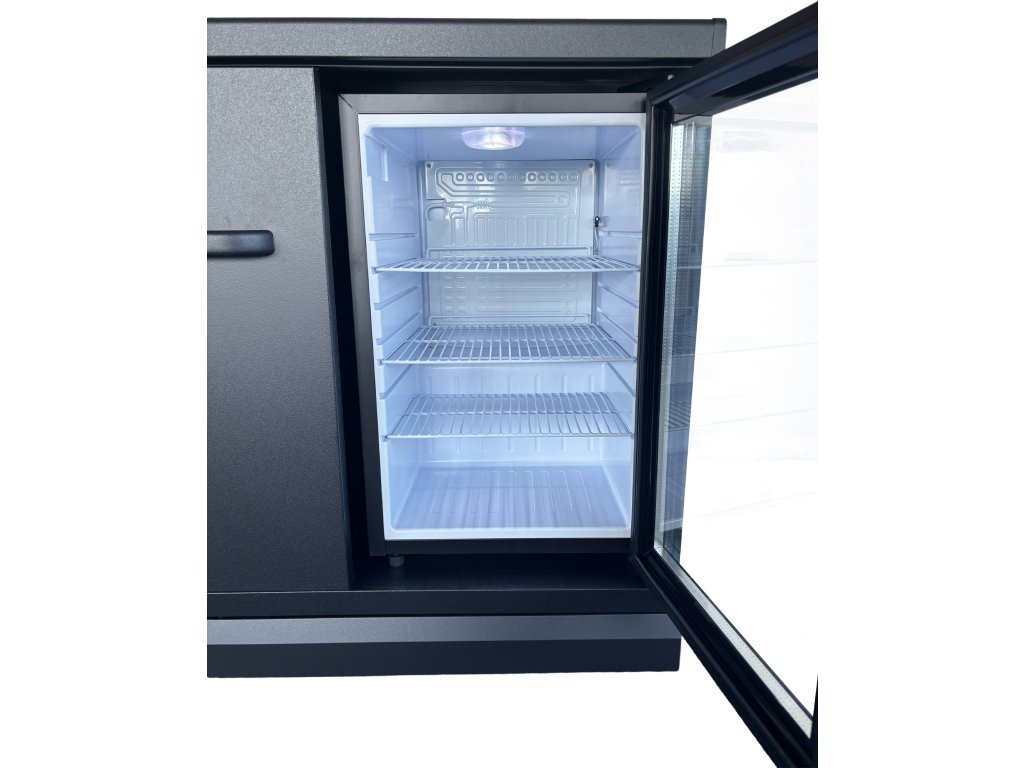Hotový komplet: skrinka Connect Cooling Unit vrátane vstavannej chladničky GRLLR Connect Fridge. Nemusíte nič riešiť zvlášť – dostanete modul s 304 nerezovou pracovnou doskou, soft-close dvierkami a robustnými kolieskami + chladničku určenú na chladenie nápojov v exteriéri. Stačí zasunúť do vašej zostavy GRLLR Connect a môžete chladiť nápoje aj ingrediencie priamo pod pergolou.
