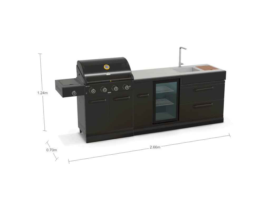 Táto vonkajšia kuchynská zostava spája plynový gril GRLLR Prime G4S so systémom GRLLR Connect do jednej čistej línie dlhej 2,66 m. Vpredu máte výkonný 4-horákový gril so bočným horákom, uprostred chladiacu jednotku s chladničkou a na konci drezový a úložný modul s doskou na krájanie.