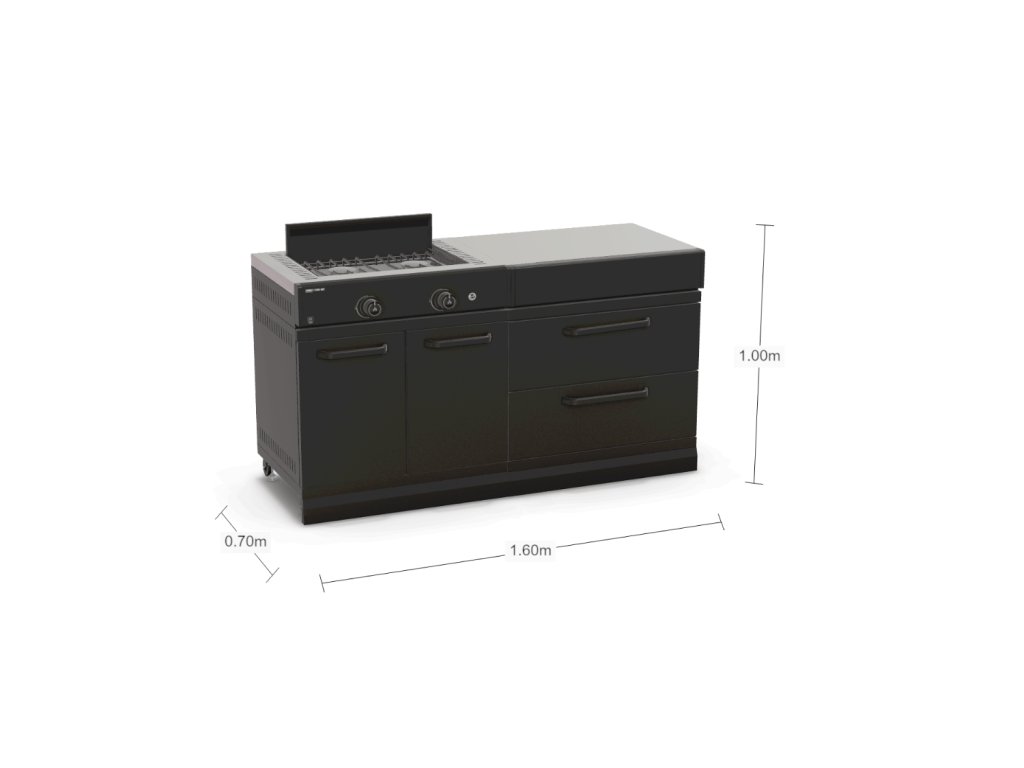 Kompaktná vonkajšia zostava, ktorá spája varný modul GRLLR Connect Stove Unit (2-horáková plynová doska) a úložný modul Connect Storage Unit. Na dĺžke len 1,60 m získate varnú zónu na panvice, wok či grilovaciu platňu a vedľa nej veľkú pracovnú plochu s dvomi priestrannými zásuvkami na náradie, koreniny a príslušenstvo. Ideálne riešenie na menšie terasy alebo ako doplnok k hlavnému grilu.