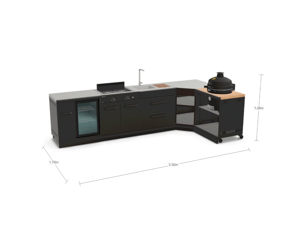 Elegantná „L“ vonkajšia kuchyňa, ktorá spája chladenie nápojov, varenie, prípravu, aj grilovanie na kamade. Hlavná línia prináša nápojovú chladničku v module Connect Cooling Unit, plynový dvojhorák Stove M2 a drezový modul so sprchovou batériou a krájacou doskou. Rohový modul Corner Unit prepojuje pracovné plochy a bočnú vetvu uzatvára Connect Expansion Unit s drevenou pracovnou doskou, na ktorej je zabudované kamado Ember 18". Otvorené police v rohu aj na expanzii poskytujú rýchly prístup k príslušenstvu.