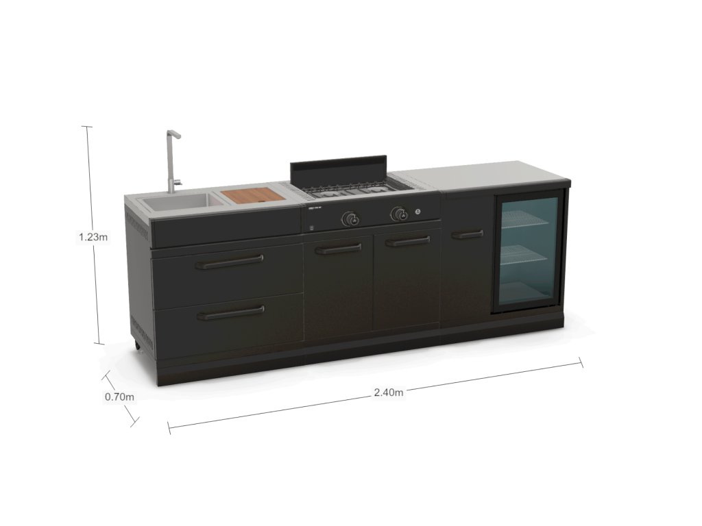 Na dĺžke 2,40 m získate všetko pod jednou linkou – vodu, varenie aj chladenie nápojov. Všetko v prémiovom antracitovom dizajne s pracovnými doskami z nerezovej ocele 304, soft-close zásuvkami/dvierkami a robustnými kolieskami s nastaviteľnými nožičkami.