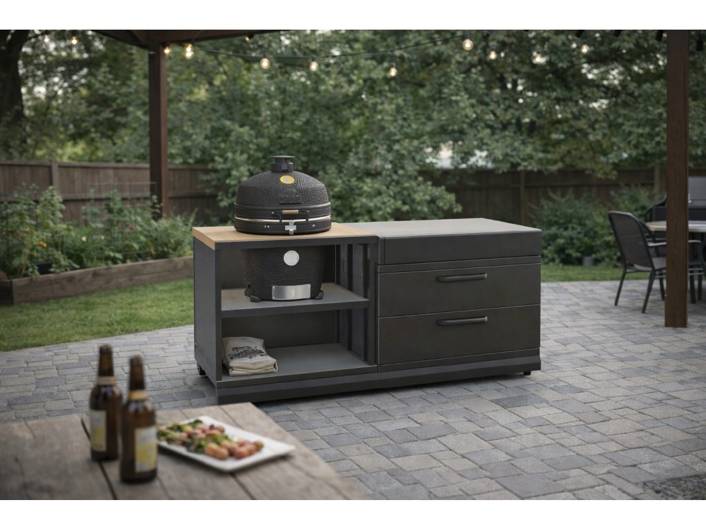 Na ľavej strane je Connect Expansion / Kamado Unit s drevenou pracovnou doskou a priestorom na osadenie kamado grilu Ember 18. Pod grilom je otvorená polica na uhlie či príslušenstvo. Na pravej strane dopĺňa zostavu Connect Storage Unit s dvomi veľkými zásuvkami a nerezovou pracovnou plochou – ideálna na prípravu a odkladanie.