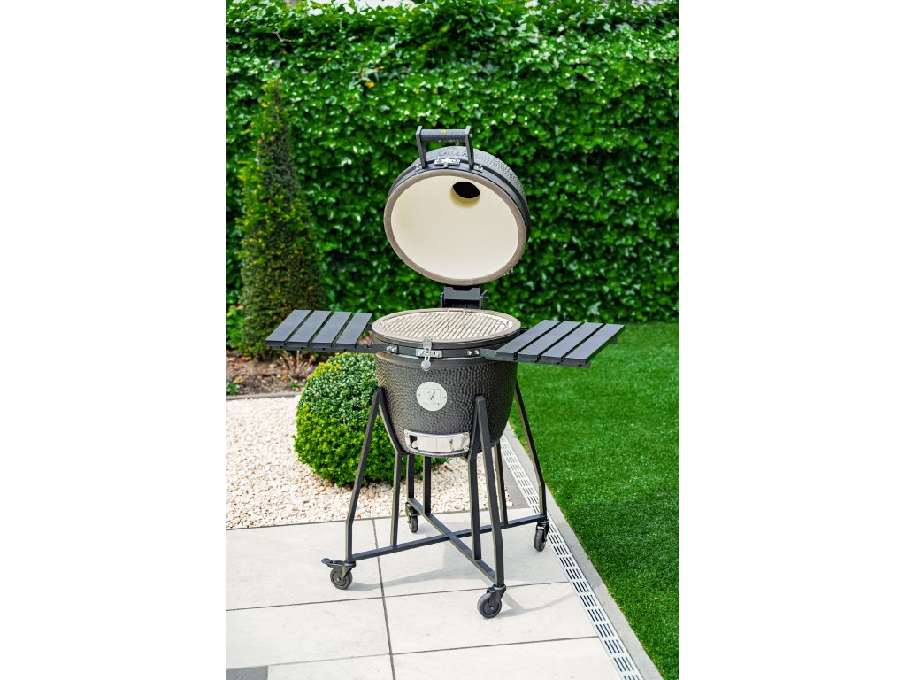 Gril je postavený na robustnom vozíku s veľkými kolieskami, z ktorých dve majú brzdu pre bezpečné zaistenie na mieste. Bočné HDDP police ponúkajú praktický pracovný priestor a háčiky na zavesenie náradia.