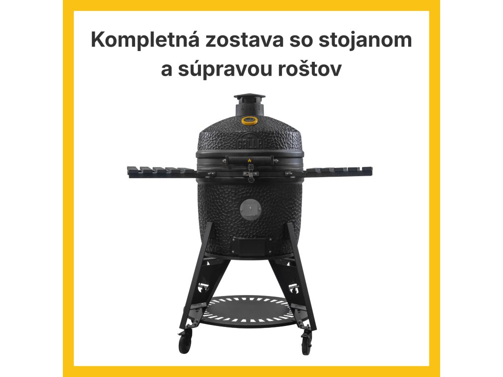 | Obsah balenia | Keramický gril GRLLR Ember Pro 23" Charcoal Black, heavy-duty vozík, teplomer GRLLR, horný vzduchový ventil z liateho hliníka, vložka na zber popola, rozdelené ohnisko, liatinový filter popola, nerezový držiak roštu, 2× polmesiacový keramický deflektor, nerezový držiak hrncov, 2× nerezový polmesiacový grilovací rošt, podávač štiepok (chip feeder), škrabka na popol, kovové bočné police s háčikmi, návod na použitie |